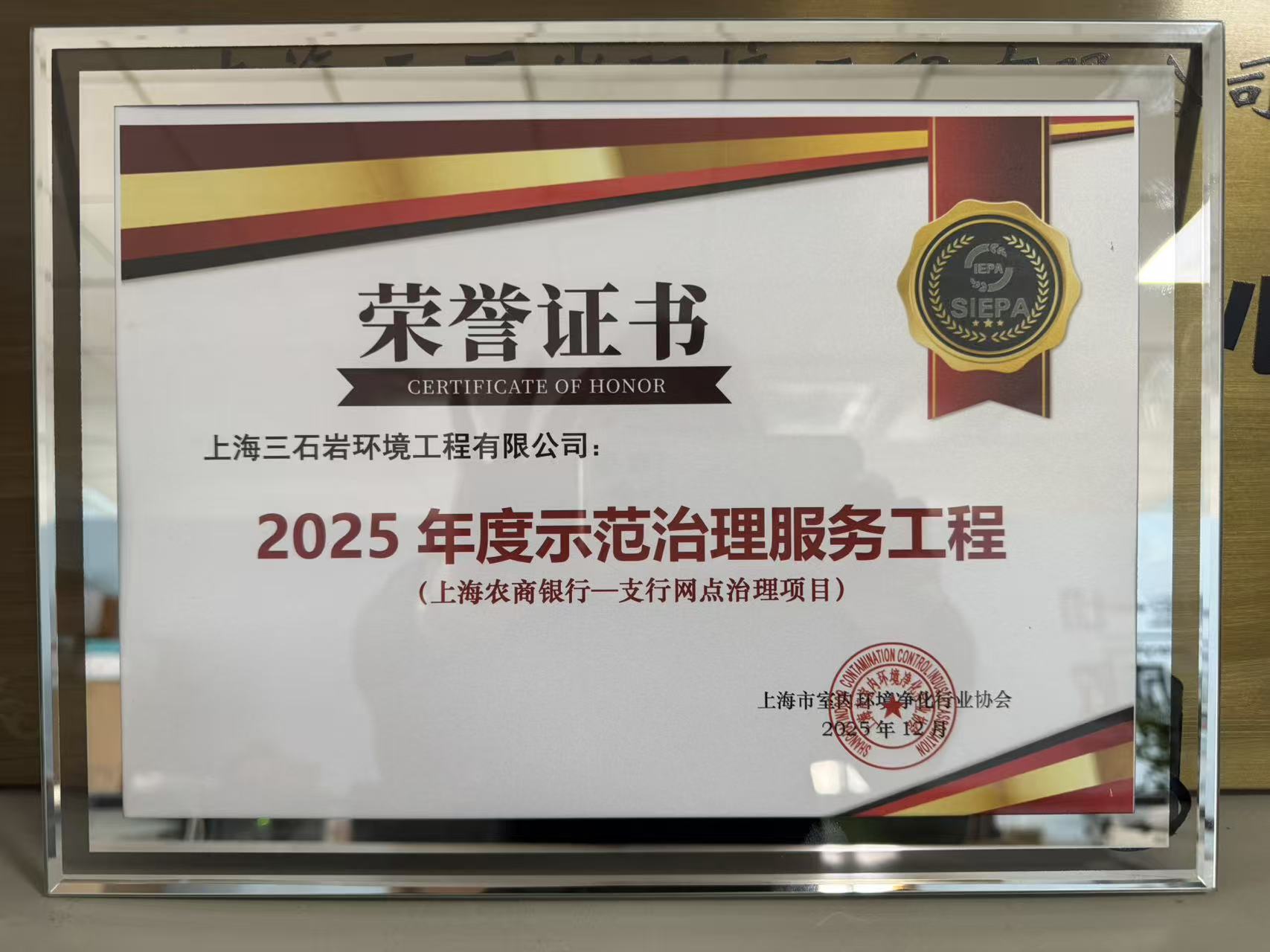 近日,上海三石岩环境工程有限公司(以下简称 “上海三石岩”)承建的 “上海农商银行 —— 支行网点治理项目” 凭借专业的技术方案、高效的治理成效及完善的服务体系,成功荣获2025年度示范治理服务工程称号,得到行业机构与客户的双重认可。这一荣誉不仅是对项目品质的高度肯定,更是对上海三石岩在环境净化领域技术实力与服务能力的有力佐证。