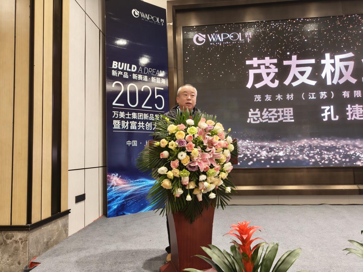 紧接着,茂友木材(江苏)有限公司总经理孔捷先生分享合作感悟:作为上游伙伴,深刻感受到万美士对品质的极致追求如何倒逼产业链共同升级,这份“敢为人先”的精神,让每一位奋斗者深感共鸣。
