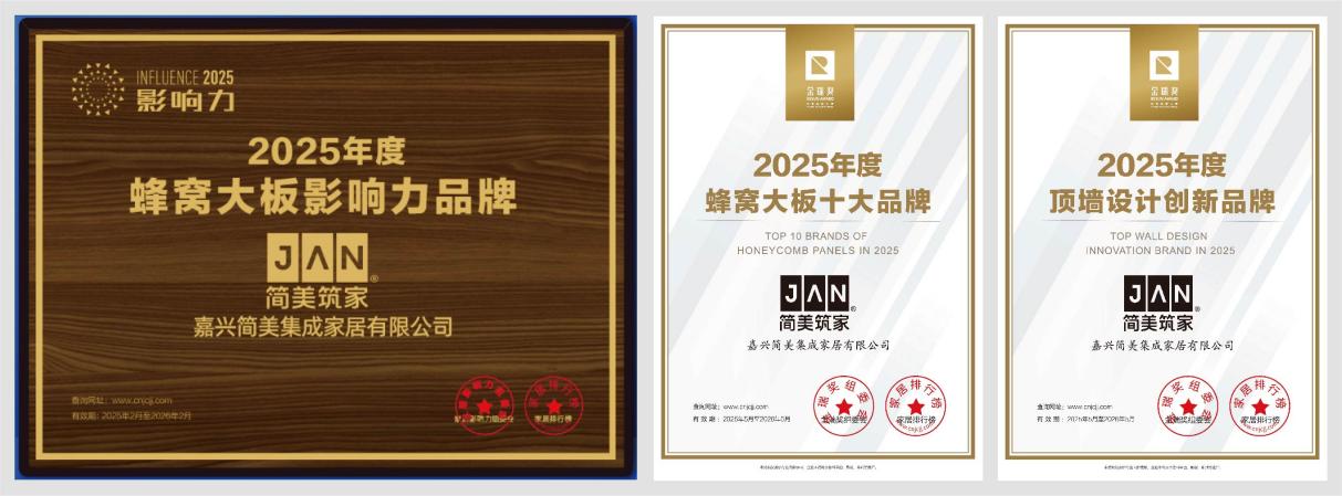 公司在2025年上半年接连荣获 “2025吊顶行业最具影响力品牌”、 “蜂窝大板吊顶十大品牌” 以及 “顶墙设计师创新品牌” 三项大奖。这些奖项分别从综合实力、技术领导力和设计创新力三个维度,肯定了简美筑家在行业中的领先地位和标杆作用。